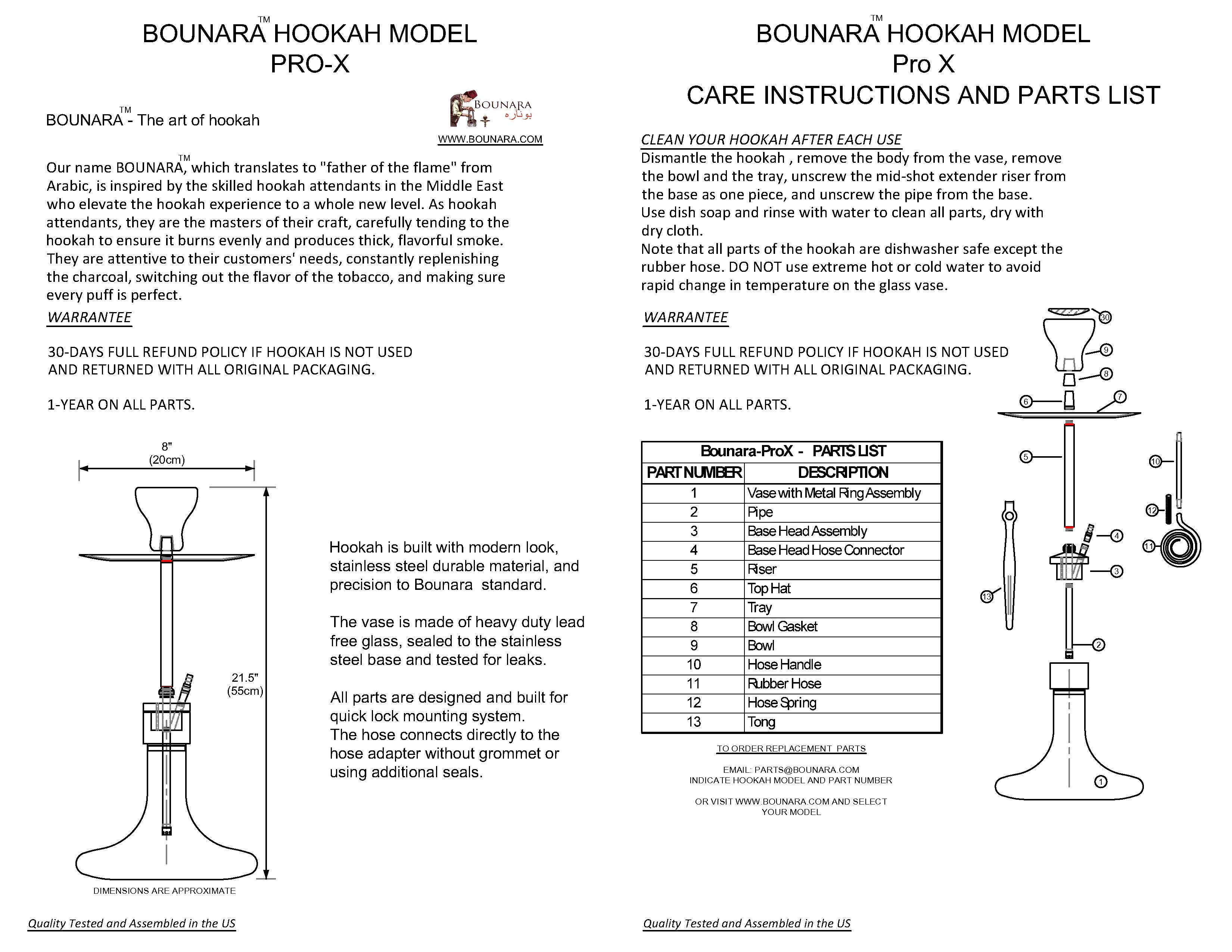 We offer a 1-year warranty on all parts. Email PARTS@BOUNARA.COM with your hookah model and part number, or click the button below to order parts online. To enlarge a chart, please click on it.