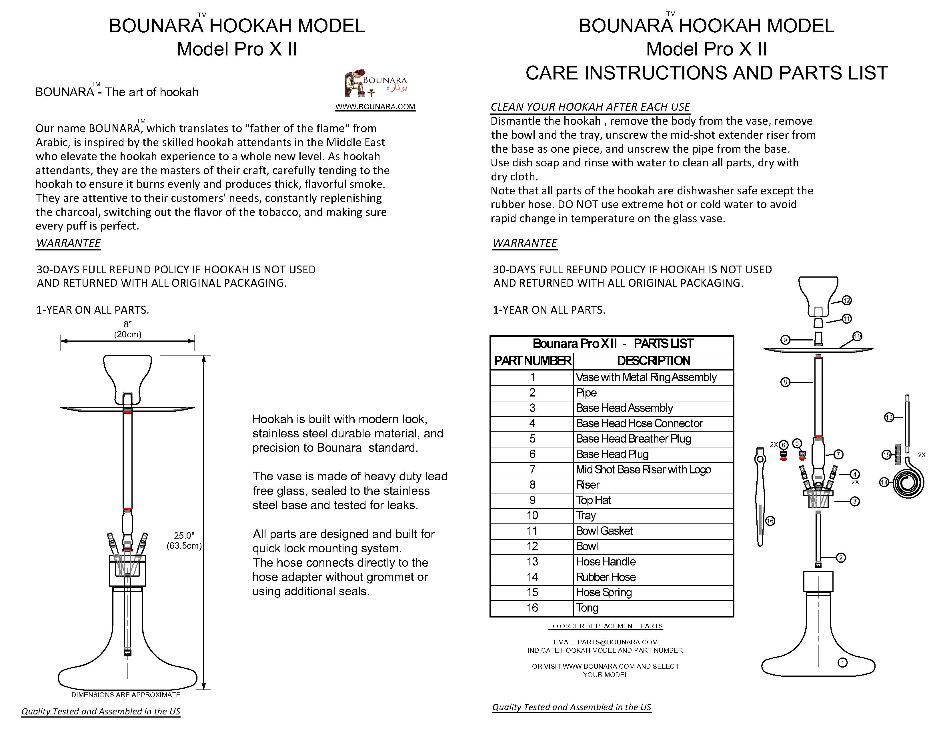 We offer a 1-year warranty on all parts. Email PARTS@BOUNARA.COM with your hookah model and part number, or click the button below to order parts online. To enlarge a chart, please click on it.